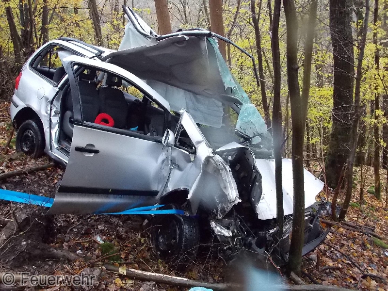 Ein PKW kam von der Fahrbahn ab, rutsche anschließend eine steile Böschung hinab und kam an einer Baumreihe mit der Fahrerseite schließlich zu stehen.